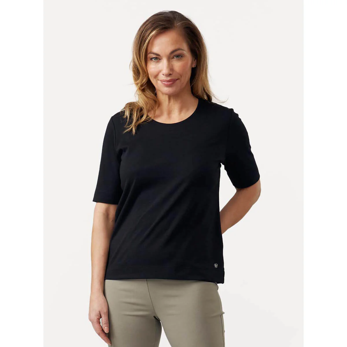 This essential round neck top in black is perfect for every season. The fabric is soft, breathable and easy to wear. The ideal piece to enhance your outfit with a scarf or jacket. Available in six classic colours.